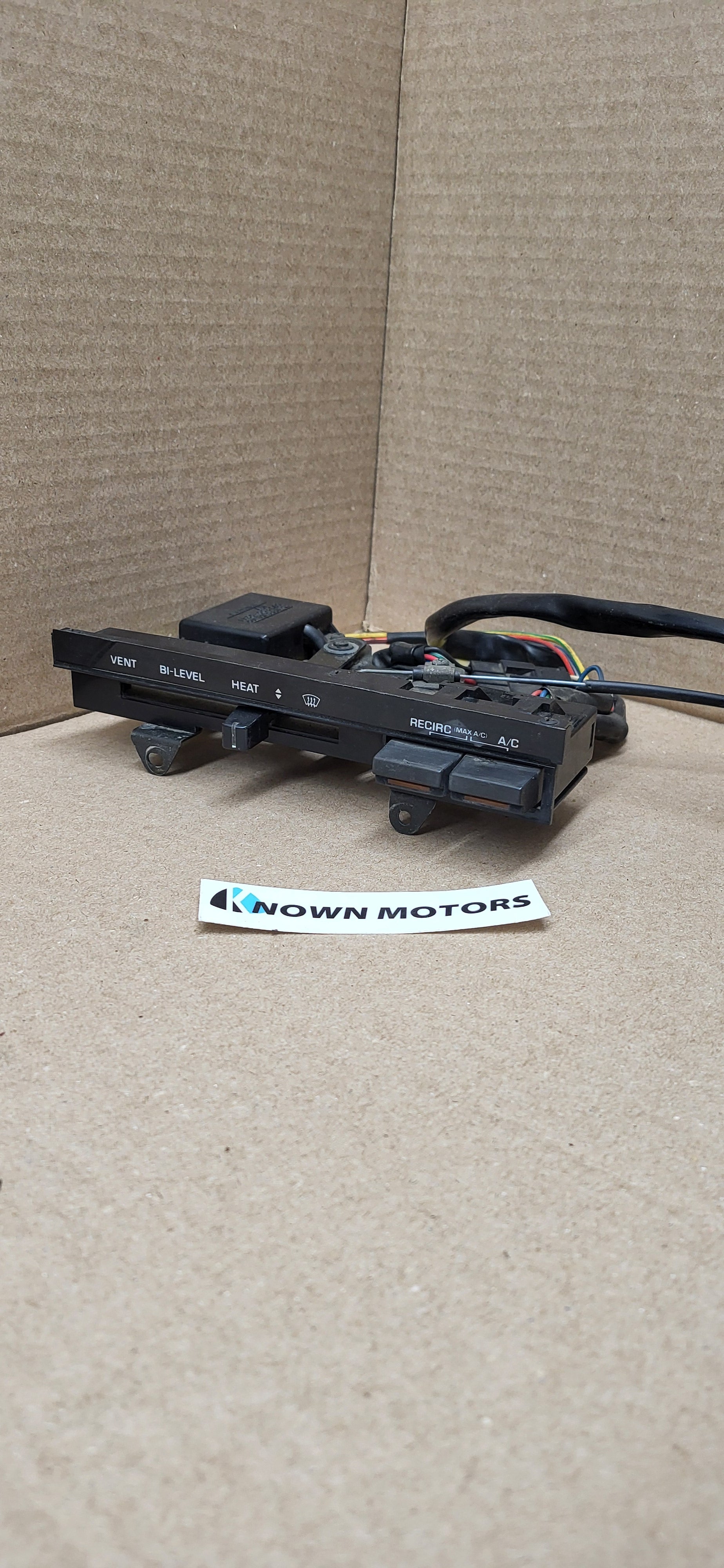This Heater Controls unit is a genuine 1981-1985 Mazda RX7 part in good condition and fully functioning. It includes an A/C switch